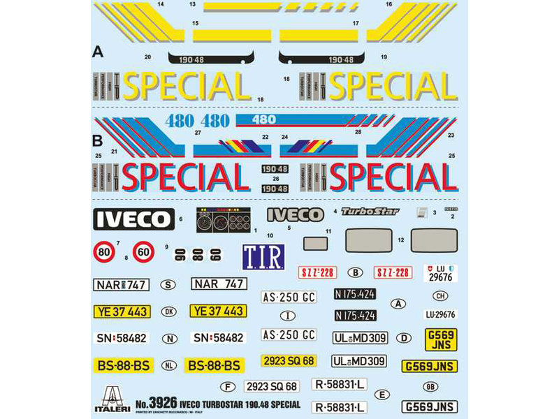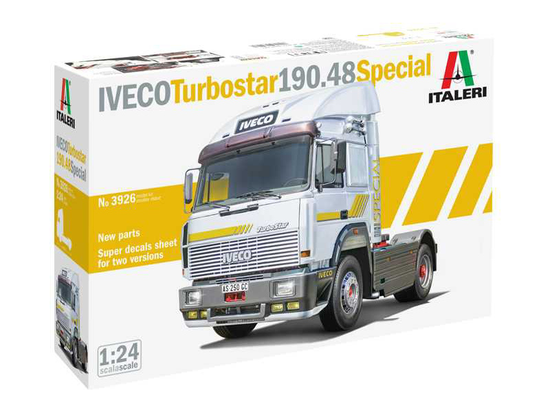 Plastikový model Italeri 3926 – tahač Iveco Turbostar 190.48 Special v měřítku 1:24 ke slepení. Délka modelu 238 mm, obtížnost 5. Balení obsahuje SUPER OBTISKY PRO 2 VERZE.