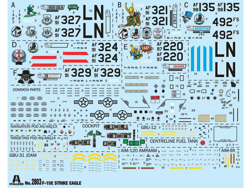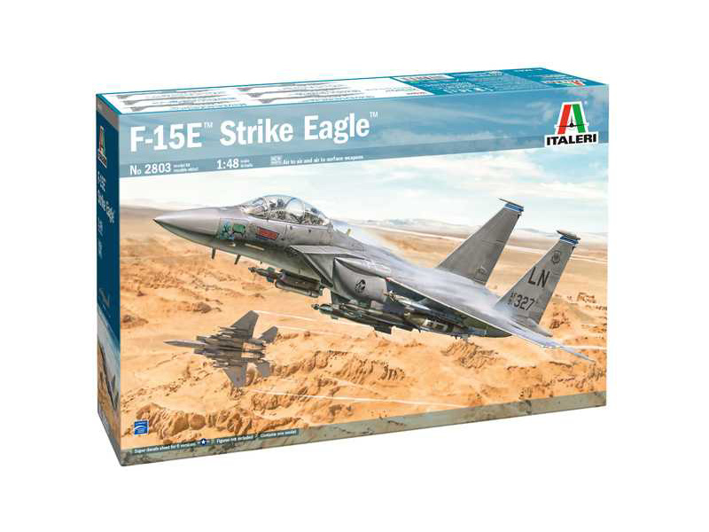 Plastikový model Italeri 2803 - letadlo McDonell F-15E Strike Eagle v měřítku 1:48 ke slepení. Délka modelu 398 mm, obtížnost 3. Balení obsahuje SKVĚLÉ OBTISKY PRO 6 VERZÍ.