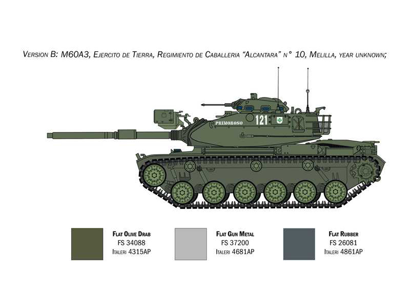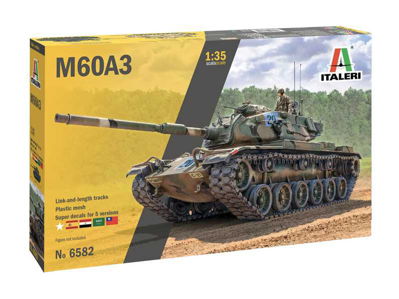 Plastikový model Italeri 6582 - tank M60A3 v měřítku 1:35 ke slepení. Délka modelu 228 mm, obtížnost 4. Balení obsahuje SKVĚLÉ OBTISKY PRO 5 VERZÍ, PÁSY Z JEDNOTLIVÝCH SPOJŮ A DÍLKŮ a PLASTOVOU SÍŤKU. FIGURKA NENÍ SOUČÁSTÍ BALENÍ.