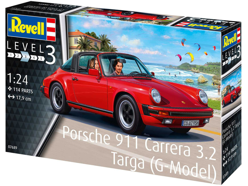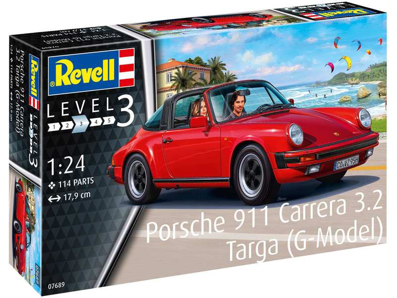 Stavebnice plastikového modelu Revell 07689 - auto Porsche 911 Carrera 3.2 Targa (G-Model) v meřítku 1:24 ke slepení. Stavebnice obsahuje 114 dílků, délka 179 mm, obtížnost 3.