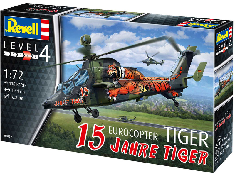 Plastikový model Revell 03839 – bojový vrtulník Eurocopter Tiger 15. výročí v měřítku 1:72 ke slepení. Stavebnice obsahuje 116 dílků, délka 194 mm, obtížnost 4.