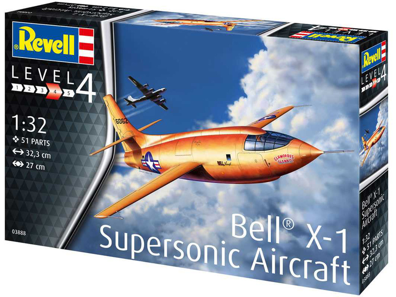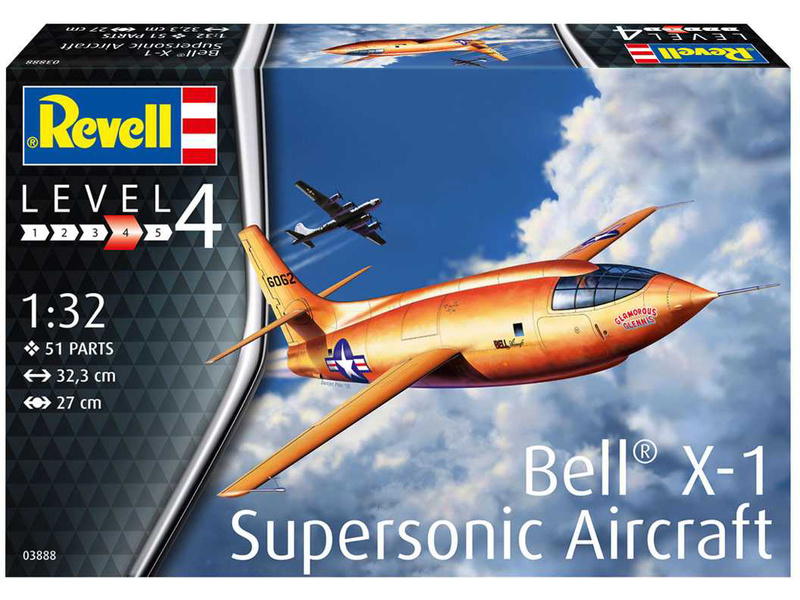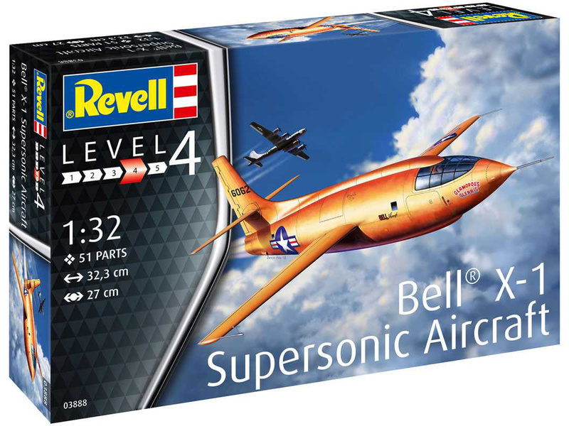 Plastikový model Revell 03888 - letadlo Bell X-1 v měřítku 1:32 ke slepení. Stavebnice obsahuje 51 dílků, rozpětí křídel 270 mm, obtížnost 4.
