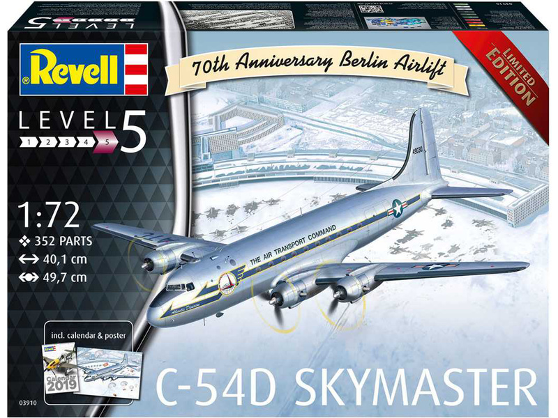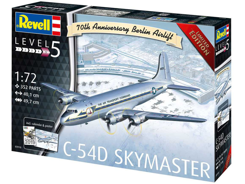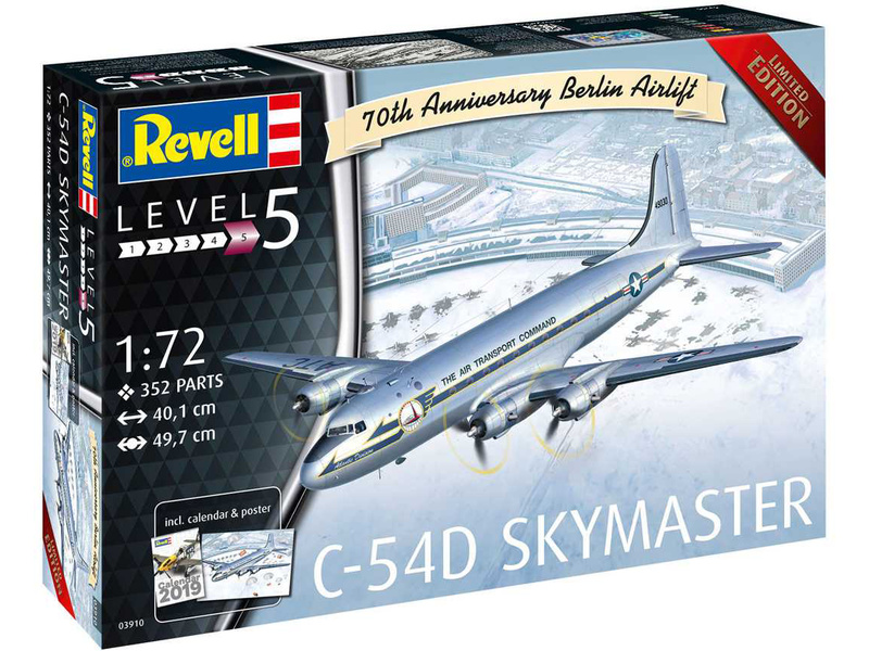 Plastikový model Revell 03910 – letoun Douglas C-54D Skymaster 1948 v měřítku 1:72 ke slepení. Stavebnice obsahuje 352 dílků, rozpětí křídel 497 mm, obtížnost 5.