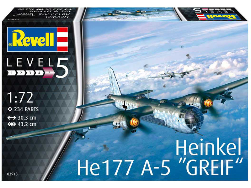 Plastikový model Revell 03913 – letadlo Heinkel He177 A-5 Greif v měřítku 1:72 ke slepení. Stavebnice obsahuje 234 dílků, rozpětí křídel 432 mm, obtížnost 5.