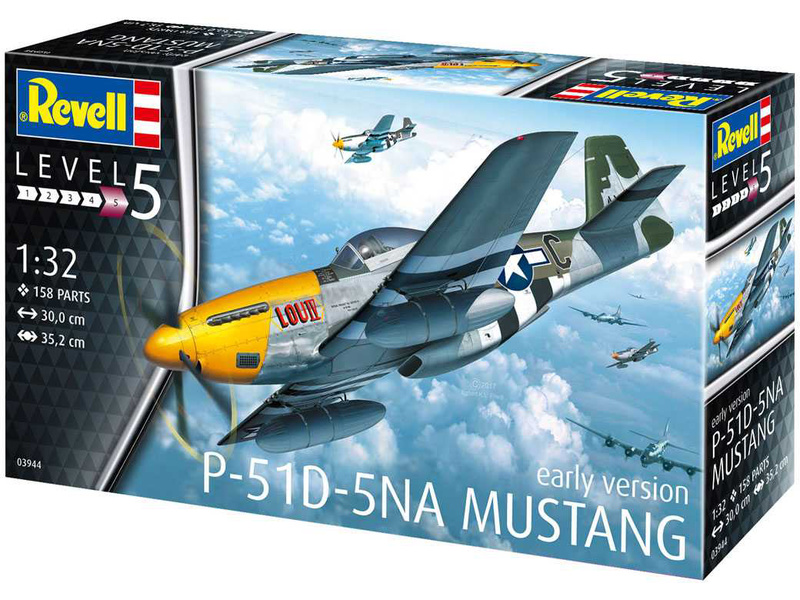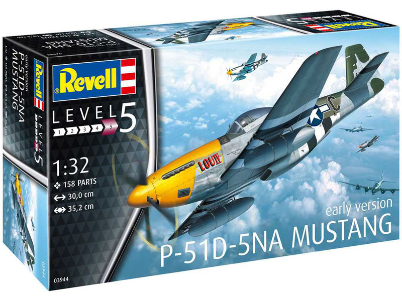 Plastikový model Revell 03944 - letadlo P-51D-5NA Mustang v měřítku 1:32 ke slepení. Stavebnice obsahuje 158 dílků, rozpětí křídel 352 mm, obtížnost 5.