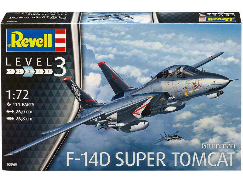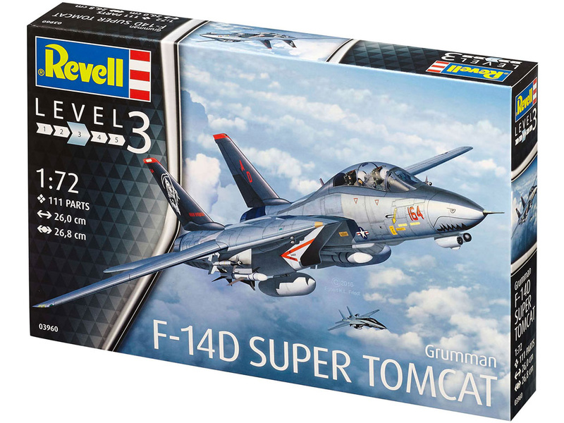 Plastikový model Revell 03960 - vojenské letadlo F-14D Super Tomcat v měřítku 1:72 ke slepení. Stavebnice obsahuje 111 dílků, rozpětí křídel 268 mm, obtížnost 3.