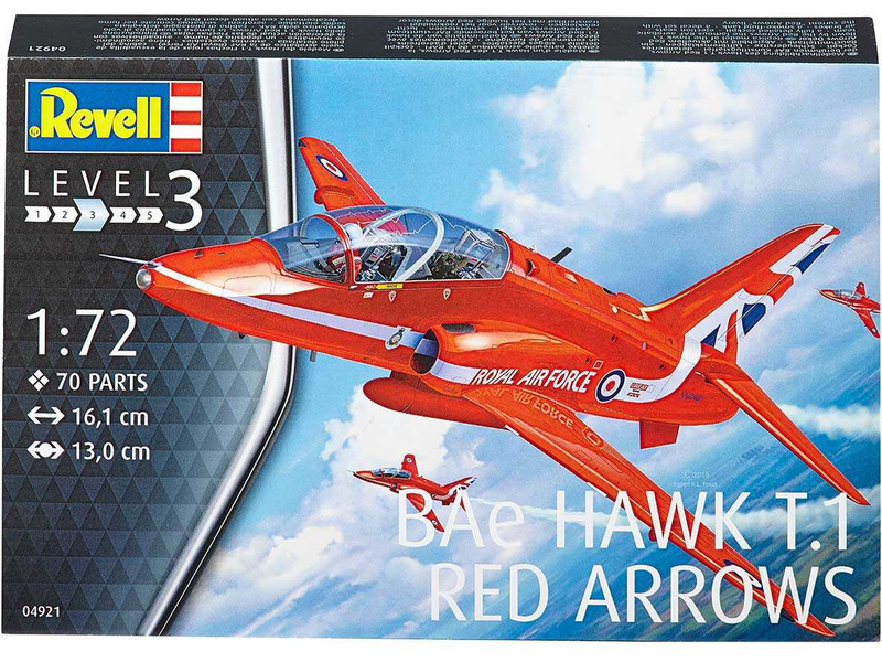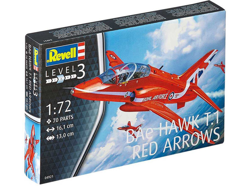 Plastikový model Revell 04921 – letoun BAe Hawk T.1 Red Arrows v měřítku 1:72 ke slepení. Stavebnice obsahuje 70 dílků, rozpětí křídel 130 mm, obtížnost 3.