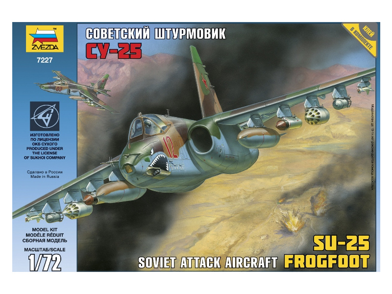 Zvezda plastikový model sovětského útočného letounu Suchoj Su-25 v měřítku 1:72 ke slepení. Stavebnice obsahuje 87 dílků, délka 180 mm, obtížnost 3.