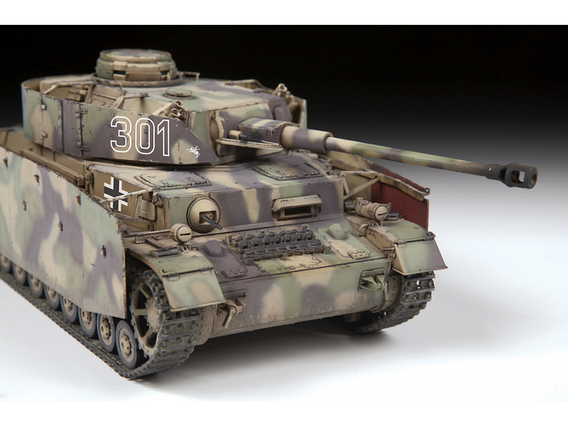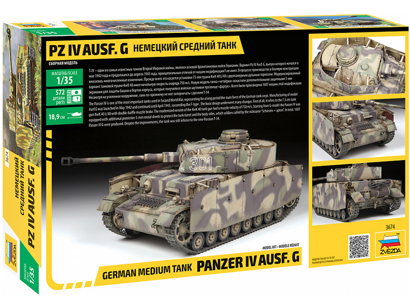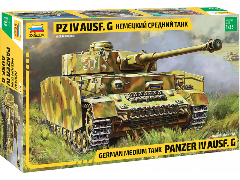 Plastikový model Zvezda 3674 - německý střední tank Pz IV Ausf. G v měřítku 1:35 ke slepení. Stavebnice obsahuje 572 dílků, délka 189 mm.