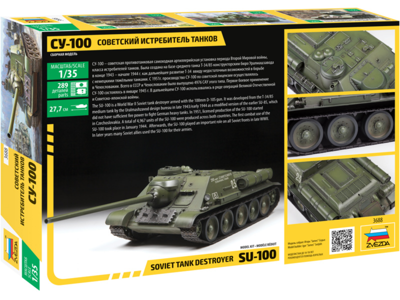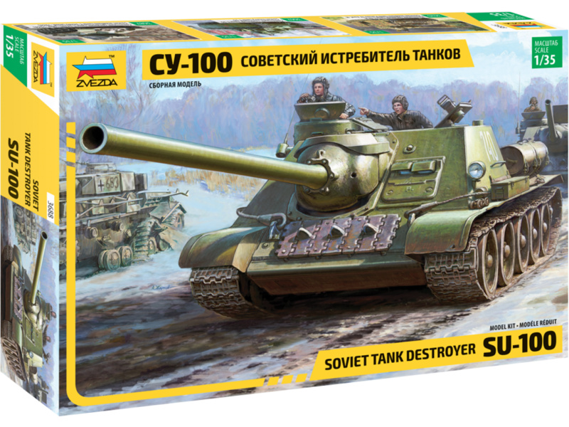 Plastikový model Zvezda 3688 - sovětský stíhač tanků SU-100 v měřítku 1:35 ke slepení. Stavebnice obsahuje 289 dílků, délka 277 mm, obtížnost 4.