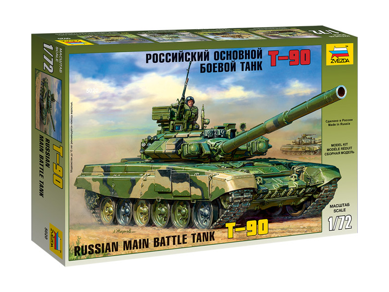 Plastikový model Zvezda 5020 - ruský hlavní bitevní tank T-90 v měřítku 1:72 ke slepení. Stavebnice obsahuje 205 dílků, délka 141 mm, obtížnost 3.