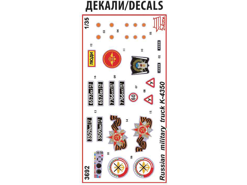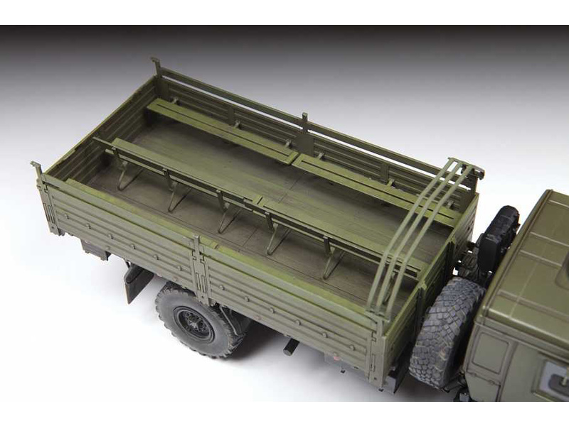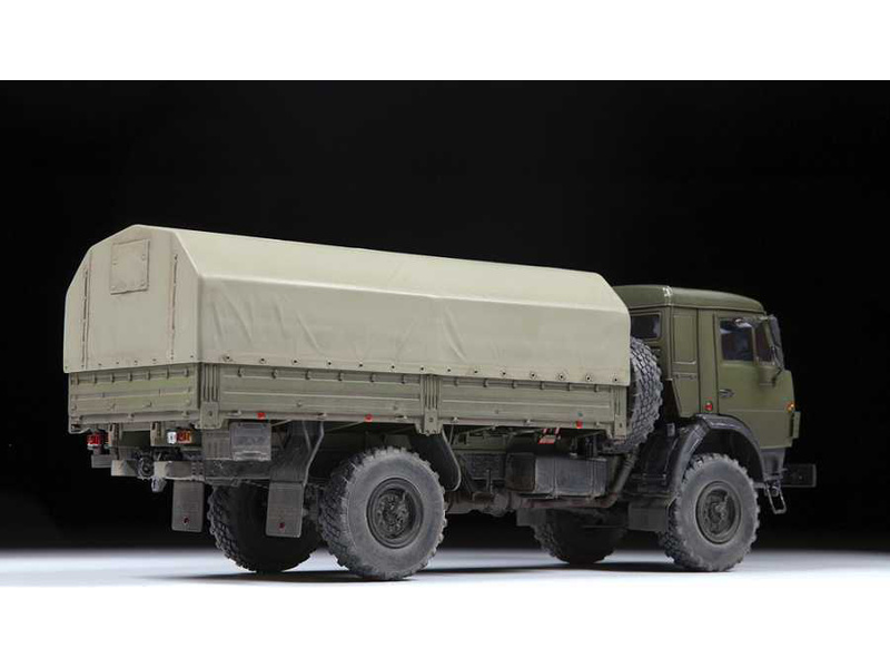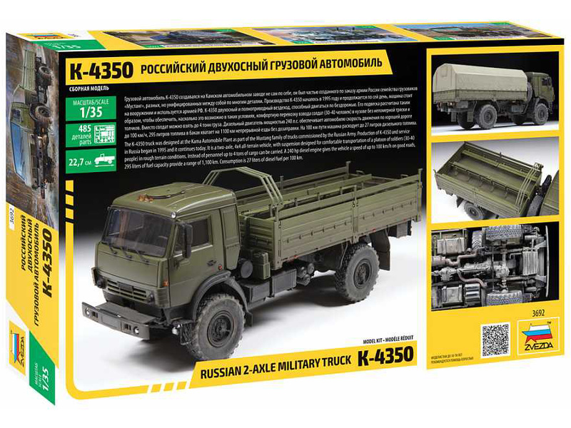Plastikový model Zvezda 3692 - dvounápravový nákladní automobil K-4350 v měřítku 1:35 ke slepení. Stavebnice obsahuje 485 dílků, délka 227 mm.