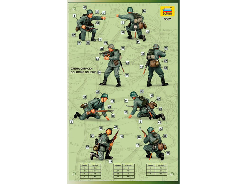 Sada figurek Zvezda 3582 – němečtí Panzergrenadiers doplňujících plastikové modely. Velikost figurek je 1:35; 5 cm. Balení obsahuje 53 dílků.