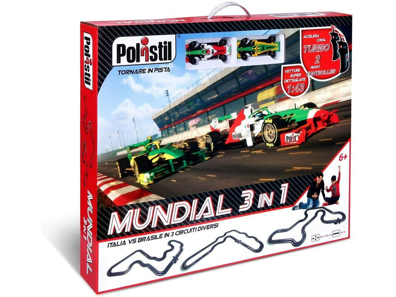 Polistil Mundial F1 - analogová elektrická autodráha v měřítku 1:43. Zajímavý tvar tratě s 3 možnostmi složení. Na trati jsou zatáčky se svodidly a křížení tratě pro vyrovnané závody. Autíčka Formule 1. Délka tratě 8.1 m, plocha pro rozložení 281 x 161cm. Napájení přes USB.