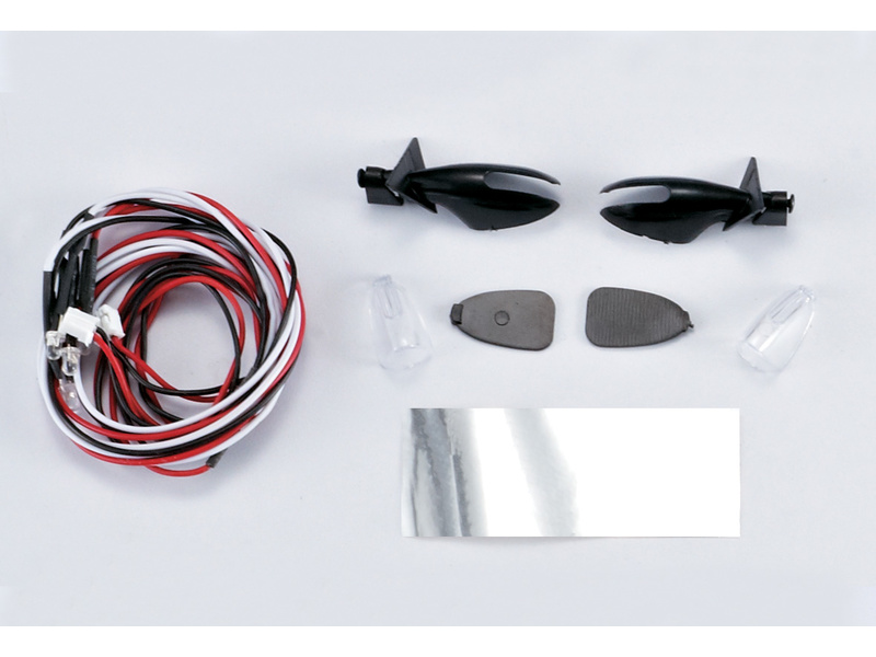 Zrcátka jsou v černé barvě a je nutno je sestavit, přilepit samolepku skla, nasadit LED diody, připevnit k Vaší karosérii RC modelu a můžete vyrazit.