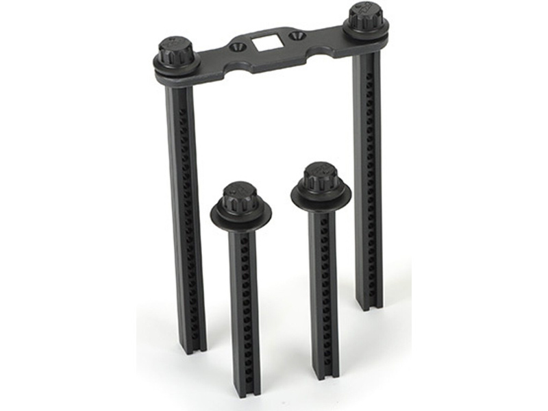 Kompletně nastavitelný držák karosérie Pro-Line 1:8 umožňuje montáž různých typů karosérií (pro Nitro Revo, E-Revo, Summit). Inovativní šroubovací systém upevnění těla (Secure-Loc Cap). Vyrobeno z ultra odolného nylonu.