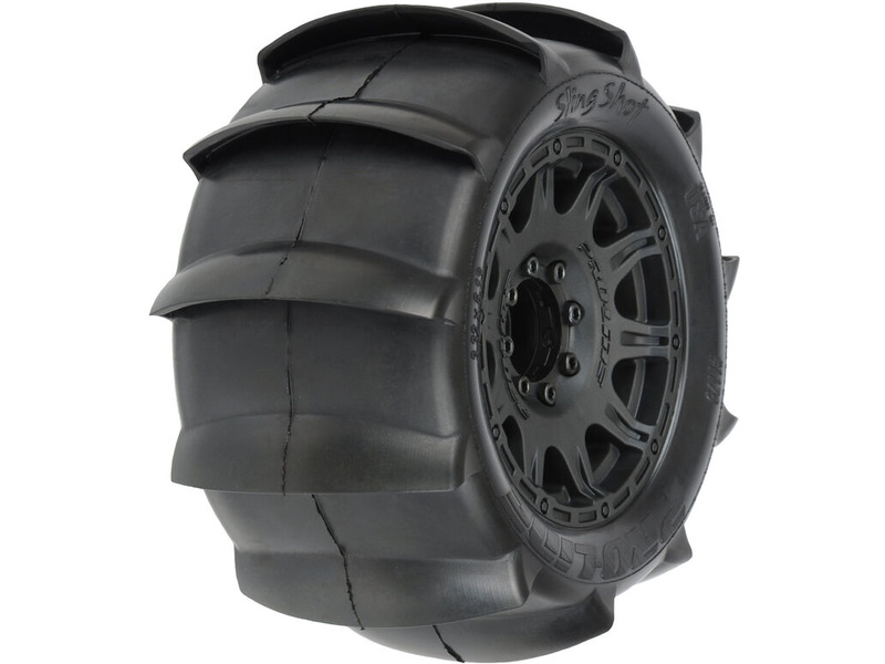 Největší forma zábavy přichází s těmito pádlovými pneumatikami Sling Shot 3.8“ instalovaných na kolech Monster Truck. Kola jsou vhodná pro Monster Trucky 1:8. Pneumatiky Sling Shot poskytují hodiny zábavy v písku, sněhu nebo dokonce v bahenním terénu. Konstrukce s 11 pádly na bloku zajišťuje maximální výkon a akceleradci.