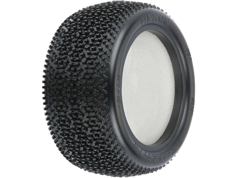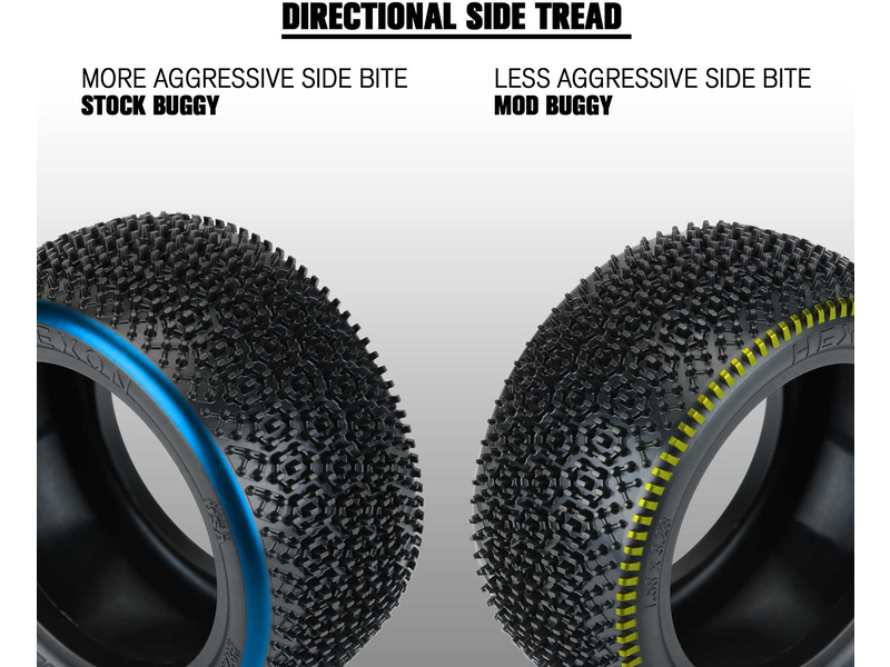 Pneumatiky Hexon se vyznačují šestiúhelníkovým vzorem dezénu s jedinečným tvarem kolíků, které poskytují delší životnost a konzistentnější výkon než předchozí generace. Stejně jako Prism 2.0 má Hexon nízký profil, který snižuje těžiště vašeho RC modelu a zlepšuje rychlost v zatáčkách. Bloky dezénu Hexon jsou umístěny tak, aby plochá hrana směřovala zepředu dozadu pro maximální přilnavost směrem vpřed. Tato nová pneumatika má také směrový boční běhoun, takže můžete vyladit výkon svých pneumatik podle aktuálních podmínek na trati. Můžete si vybrat, zda namontujete standardní kolíky na vnější stranu pro agresivnější jízdu v zatáčkách, nebo namontujete svislé boční kolíky na vnější stranu pro menší boční trakci.