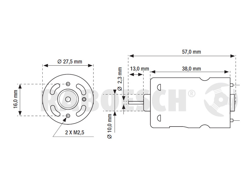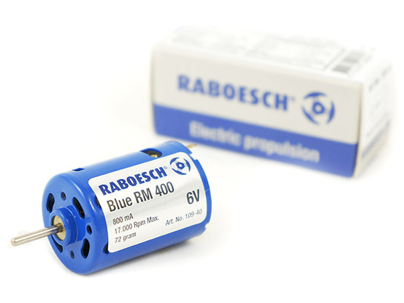 Raboesch motor stejnosměrný Blue RM-400 6V, napájení 3-6V DC, průměr-délka hřídele 2,3mm – 13mm, hmotnost 72g, Maximální točivý moment 214g.cm, otáčky při max. účinnosti 7300ot/min.