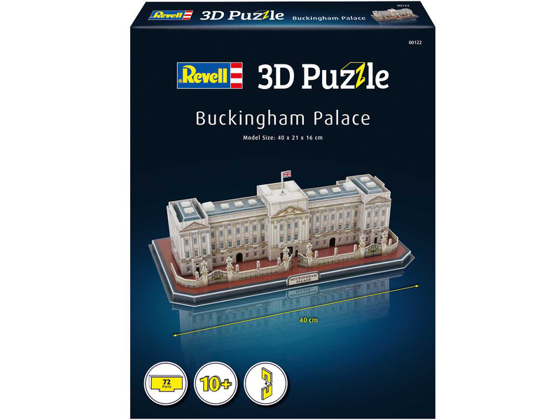 Prostorové 3D Puzzle Revell 00122 – Buckinghamský palác. Stavebnice má 72 dílků, výsledné rozměry modelu jsou 400 x 210 x 160 mm.