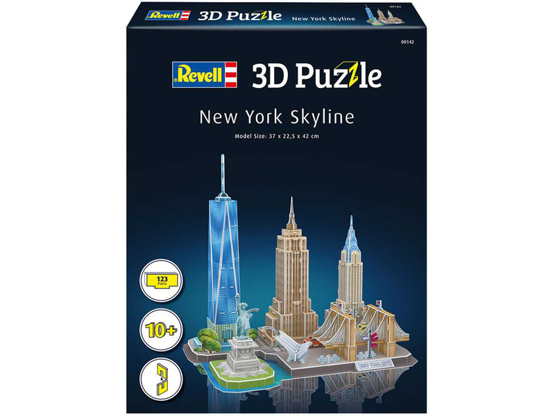 Prostorové 3D Puzzle Revell 00142 – panorama New Yorku. Stavebnice má 123 dílků, výsledné rozměry modelu jsou 370 x 225 x 420 mm.