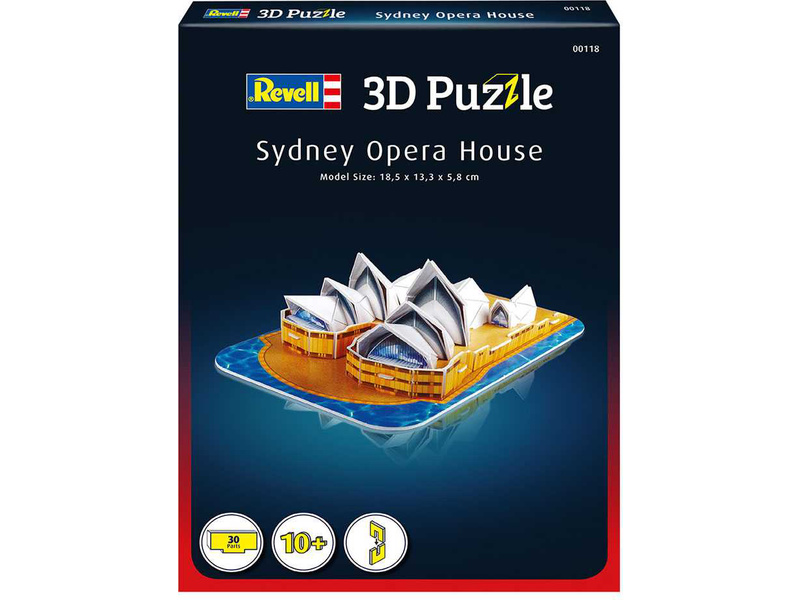 Prostorové 3D Puzzle Revell 00118 – Opera v Sydney. Stavebnice má 30 dílků, výsledné rozměry modelu jsou 185 x 133 x 58 mm.