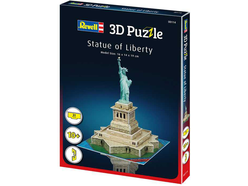 Prostorové 3D Puzzle Revell 00114 – Socha svobody. Stavebnice má 31 dílků, výsledné rozměry modelu jsou 160 x 160 x190 mm.