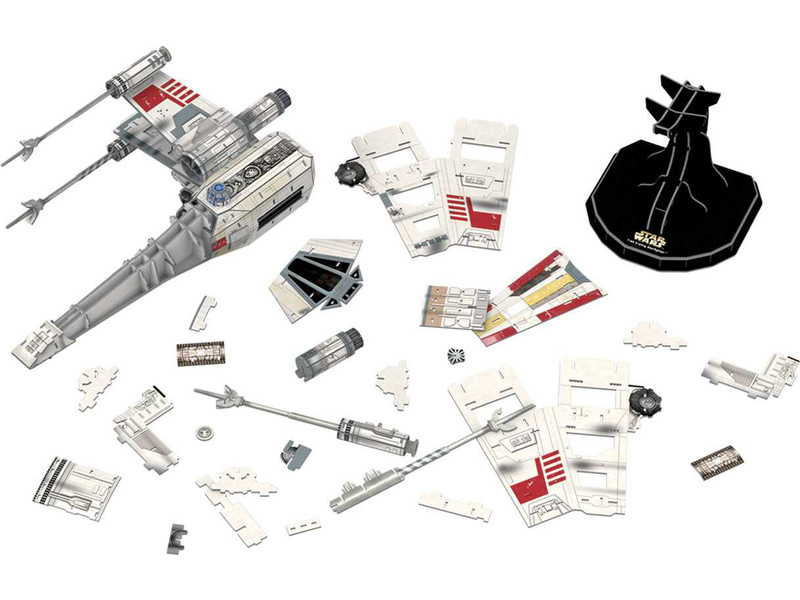 Prostorové 3D Puzzle Revell 00316 – Star Wars T-65 X-Wing Starfighter v měřítku 1:35. Stavebnice má 160 dílků, výsledné rozměry modelu jsou 345 x 380 x 260 mm.