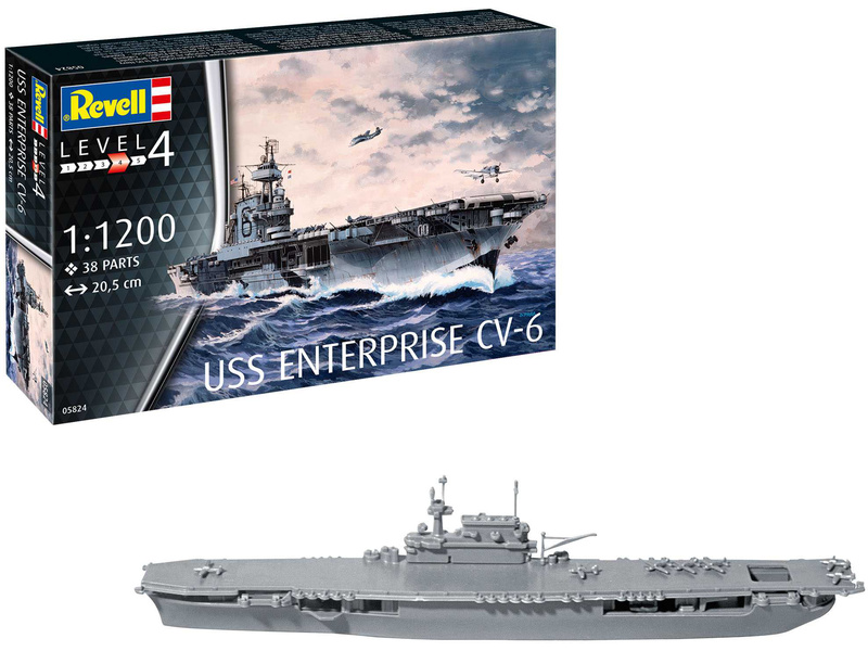 Plastikový model Revell 65824 - loď USS Enterprise CV-6 v měřítku 1:1200 ke slepení. Stavebnice obsahuje 83 dílků, délka 205 mm, stavební obtížnost 4. Součástí balení jsou akrylové barvičky, štětec a lepidlo.
