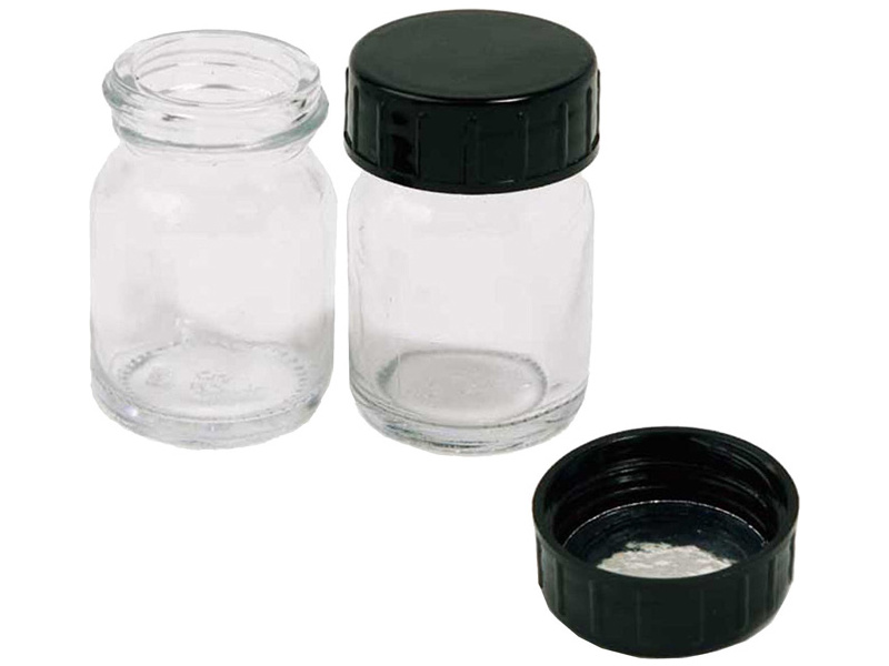 Skleněná nádoba s víčkem (25 ml) pro stříkací pistole pro zkušené airbrushery. Slouží také jako zásobník barvy pro stříkací pistole Revell řady Standard a Master.