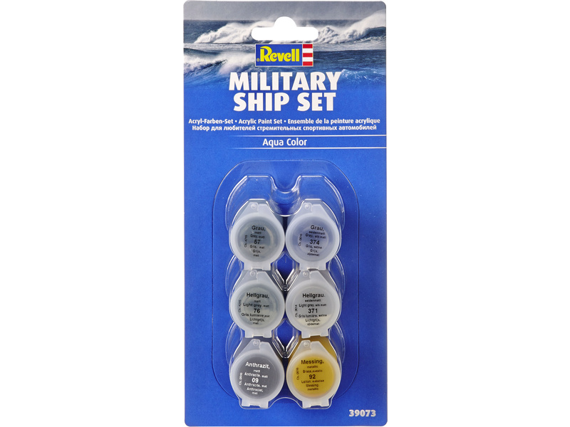 Sada šesti akrylových barev pro modeláře Revell 39073 Aqua Color nejčastěji používaných na vojenských lodích. Barvy jsou po 5 ml.