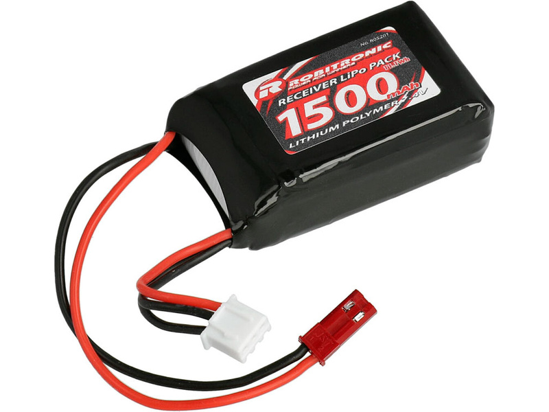 Robitronic přijímačový LiPo akumulátor 7.4 V 1500 mAh se silovým konektorem JST a servisním konektorem JST-XH. Rozměr 55 x 32 x 24 mm, hmotnost 64 g.