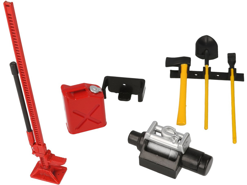 Udělejte si svůj RC model auta realističtější. Robitronic Vám nabízí detailně zpravované makety nástrojů. Sada je vyrobena z odolného plastu v červené barvě. Sada obsahuje držák pro sekeru, rýč a zvedák, držák s benzinovou nádobou, naviják a vysoký zvedák.