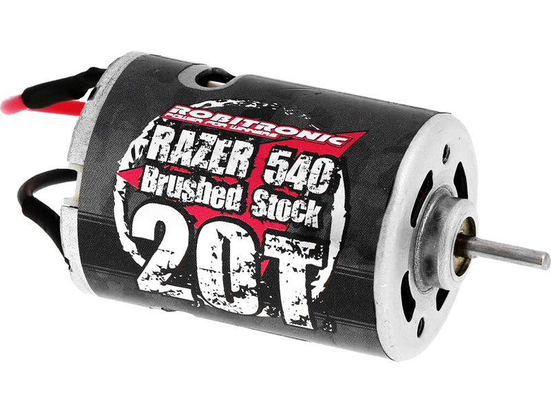 Stejnosměrný motor Robitronic Razer řady 540 s 20 závity. Kluzné bronzové ložiska, rotor má 3 vinutí, chlazení je zajištěno vnitřním ventilátorem. Rozměry ø36x54 mm, průměr hřídele je 3.17 mm (1/8").