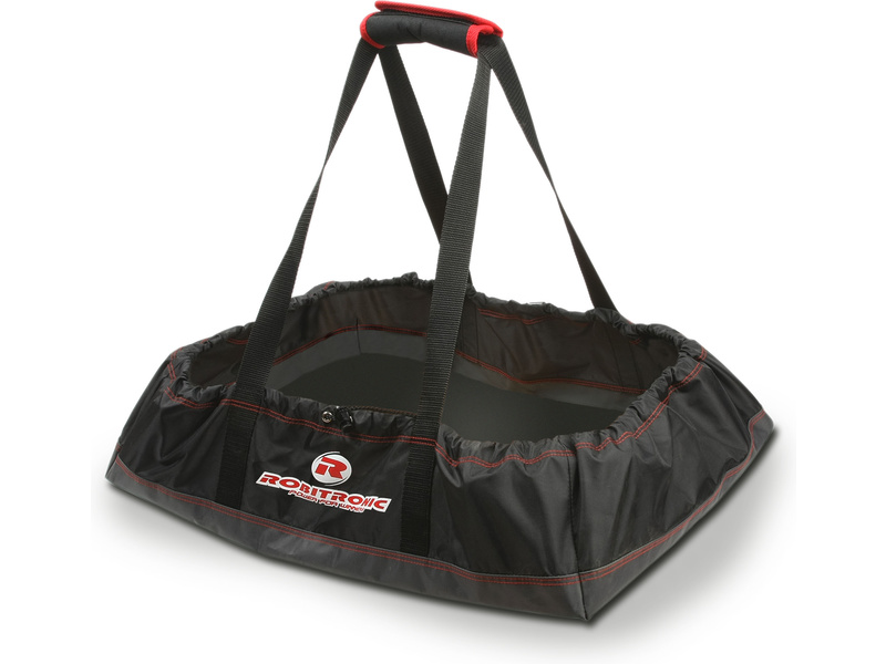 Robitronic taška pro auta Truggy 1:8 má rozměry 44 x 57 x 16 cm, na konci lemu je stahovací šňůra. Délka ucha je cca 30 cm. Pevná prošitá textilie s pevnými uchy. Uložte model po jízdě do tašky a udržte sedadla, či zavazadlový prostor čistý a suchý.