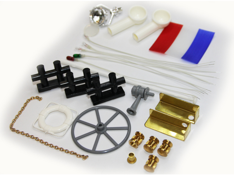Příslušenství pro RC model lodi ROMARIN Dolly - sada maketových doplňků, jako kolo kormidla, záchranné kolo, světlomet, osvětlení LED, výlisek houkačky, vlajka, řetízek, drobné doplňky.