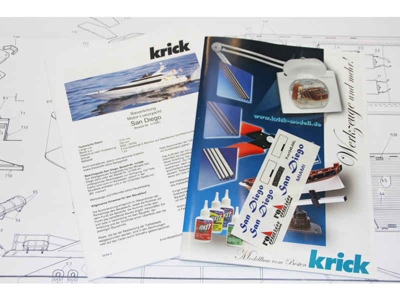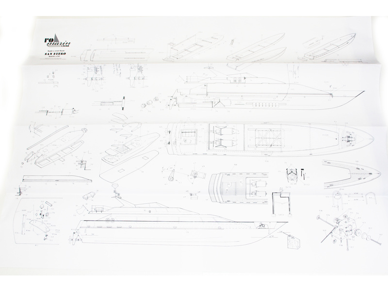 Stavebnice RC modelu luxusní jachty San Diego v měřítku 1:25 od firmy ROMARIN. Model je 1,27 m dlouhý, vyniká realistickou plavbou. Obsahuje plastové díly trupu, paluby a interiéru, dřevěné součásti konstrukce, průhledný díl kabiny, kovové součásti, montážní součásti a příslušenství, návod.