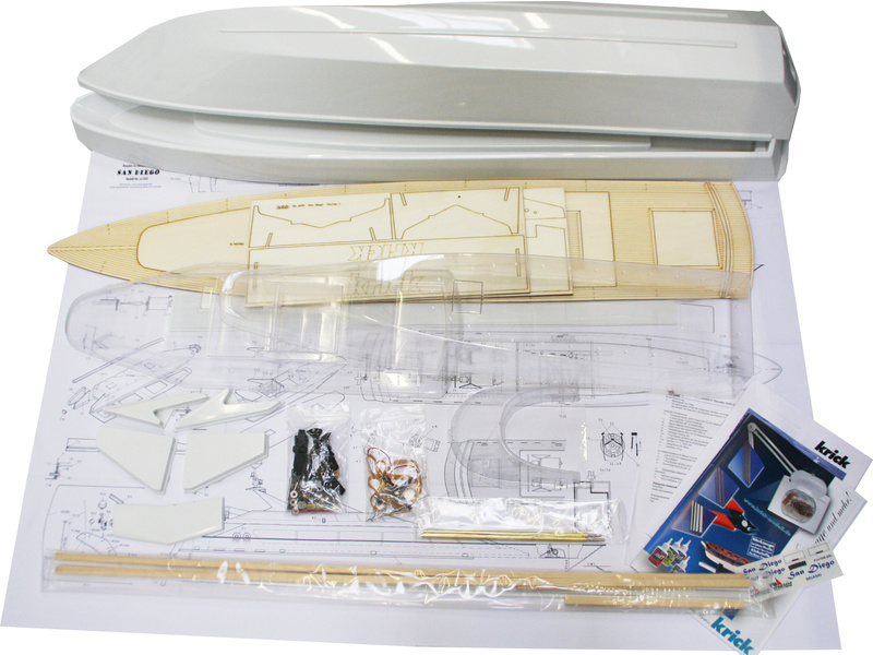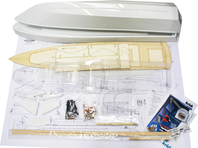 Ve stavebnici RC modelu luxusní jachty San Diego v měřítku 1:25 jsou obsaženy trup a paluba z hluboce taženého z plastu, čiré výlisky, laserem řezané dřevěné díly pro palubu vnitřní vybavení a můstek, dřevěné lišty, 2x náhon s hřídelemi, spojkami, kardany, lodními šrouby a kormidly. Díly pro montáž RC soupravy, obtisky, návod ke stavbě, český návod.