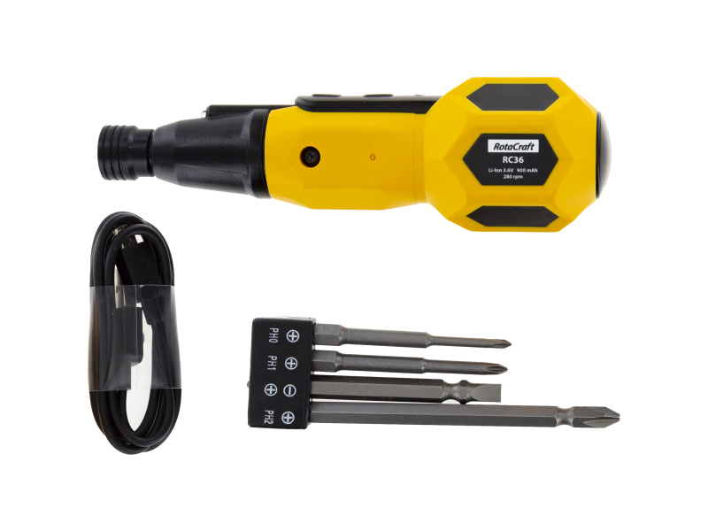 Rotacraft RC36 elektrický šroubovák USB je výkonný, kapesní dobíjecí elektro šroubovák pro kutily, hobby a elektroniku. Tento šroubovák je ideální pro stísněné prostory a úzká místa, kde tenký hrot a LED světlo poskytnou možnost manipulace. Obsahuje vestavěnou nabíjecí LiIon baterii s nabíjecím kabelem micro USB, nabitá je za pouhých 60 min.