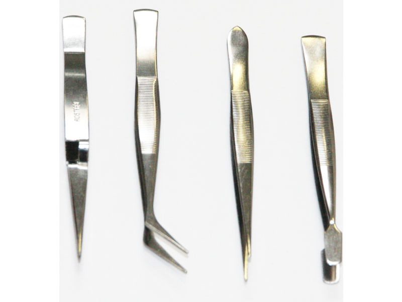 Sada pinzet z nerezové oceli. V sadě reverzní pinzeta, zahnutá pinzeta, špičatá a plochá pinzeta.