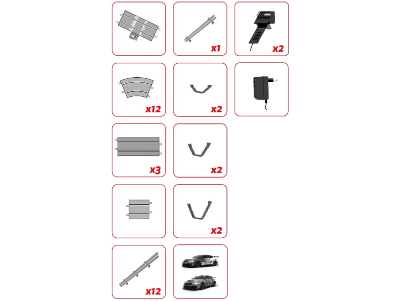Balení obsahuje traťové díly, svodidla, most, 2x dráhové autíčko, 2x ovladač a napájecí zdroj.