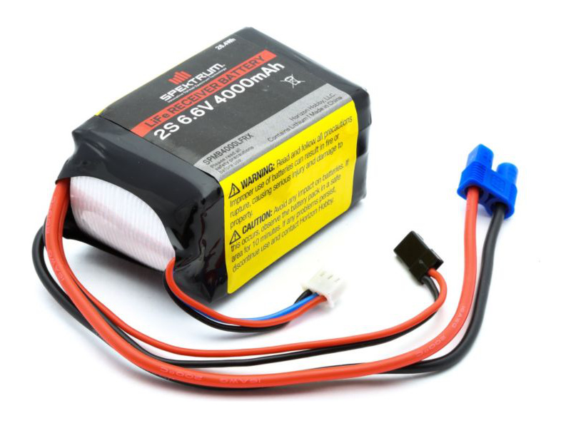 Přijímačová dvoučlánková LiFe baterie 6,6V s kapacitou 4000 mAh s konektorem EC3/JR a konektorem balancéru JST-XH. Hmotnost 235 g, rozměry 73 x 48 x 39 mm.