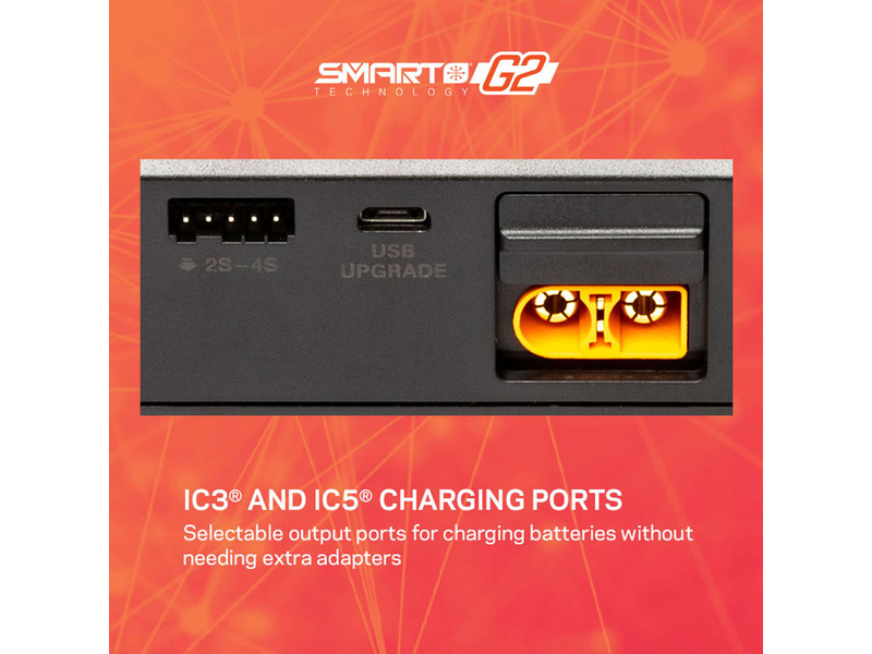 Nabíječ Spektrum™ S155 Smart G2 AC obsahuje výstupní konektory IC3® a IC5®. Pomocí posuvníku nad konektory vyberte konektor IC3® nebo IC5® a poté můžete ihned nabíjet baterii proudem až 5 A s příkonem až 55 W. Baterie Smart G2 můžete nabíjet a balancovat jenom jedním připojením do konektoru IC3® nebo IC5®. Není nutný kabel s konektorem balancéru!