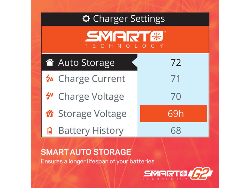 Stejně jako u jiných baterií Smart, nemusíte nastavovat vlastní předvolby nabíjení baterie Spektrum™ Smart G2, pokud nebudete chtít parametry změnit. Když je baterie Smart G2 LiPo připojena k nabíječce Spektrum™ Smart, načtou se její jedinečné parametry nabíjení a informace o zdraví do nabíječe z integrovaného paměťového mikročipu. Prostřednictvím nabíječe můžete zobrazit a nastavit předvolby, jako je třeba proud, takže vše, co je k nabití baterie zapotřebí, je připojení k vašemu nabíječi SMART. O zbytek se stará technologie SMART.