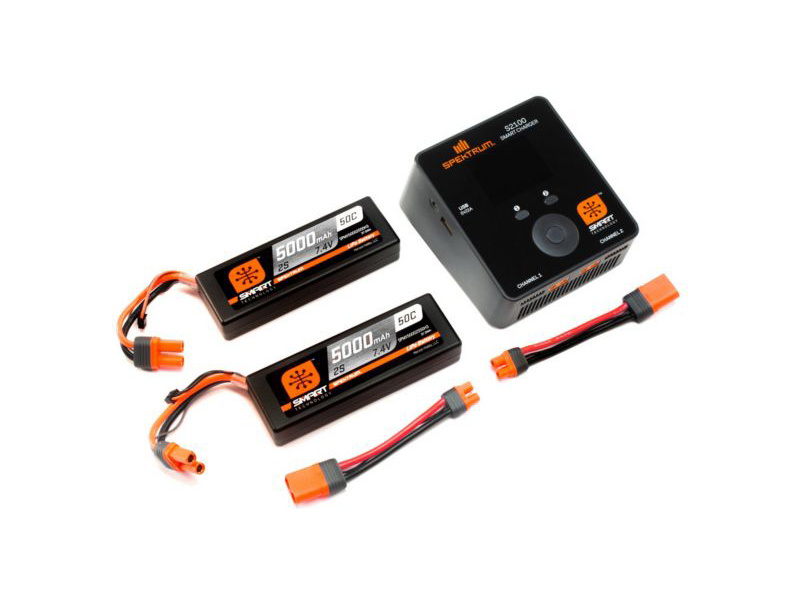 Spektrum Smart PowerStage 4S je sada 2 baterií LiPol 5000mAh 2S 7.4V 50C Smart Hardcase IC5 a nabíječe Spektrum S2100 AC Smart 2x100W s 2ks adaptéry IC3/IC5. Balíček pro náročné uživatele RC modelů aut, kteří potřebují pro své auto výkonné baterie s technologií SMART.
