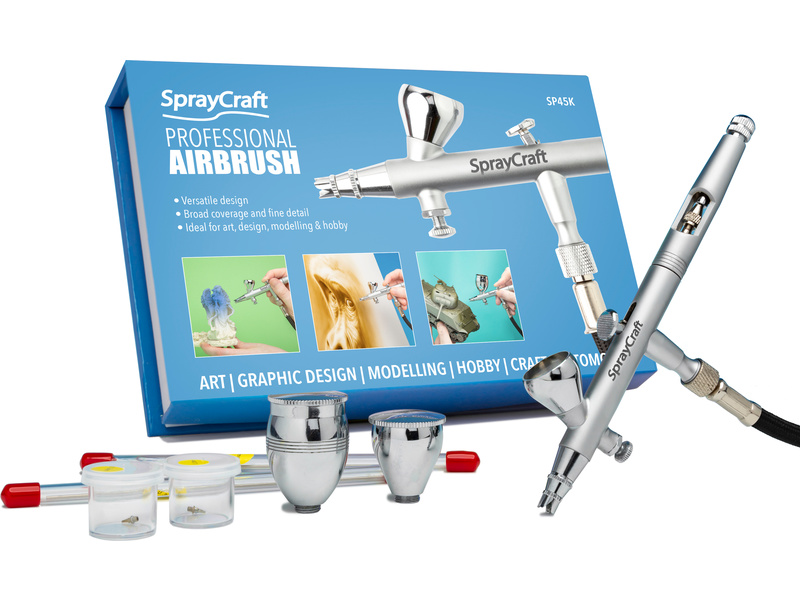 Spraycraft airbrush profesionální dvoučinná stříkací pistole SP45, kdy se stiskem spouště uvolní vzduch a zpětným pohybem se uvolní barva. Sada obsahuje 3 nádobky, 3 sady trysek (0,2, 0,3 a 0,5 mm). Možnost omezení maximálního proudu barvy a vzduchu.