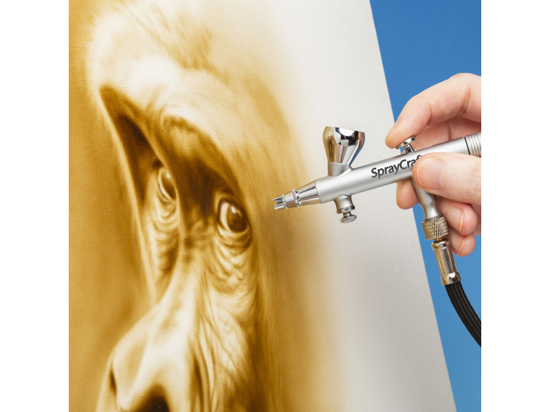 Spraycraft airbrush profesionální dvoučinná stříkací pistole SP45, kdy se stiskem spouště uvolní vzduch a zpětným pohybem se uvolní barva. Trojice výměnných nádobek (2 ccm, 7 ccm a 12 ccm) s vrchním plněním barvy, 3 sady trysek (0,2 mm, 0,3 mm a 0,5 mm). Pistole dále obsahuje šroub pro doladění proudu vzduchu a šroub pro omezení maximálního množství dávkované barvy. Pro profesionály Art, umění a grafiku. Závit pro šroubení hadice se závitem G1/8". Vynikající pro velmi jemné detaily, vyvážené tělo pistole, dobře se drží.