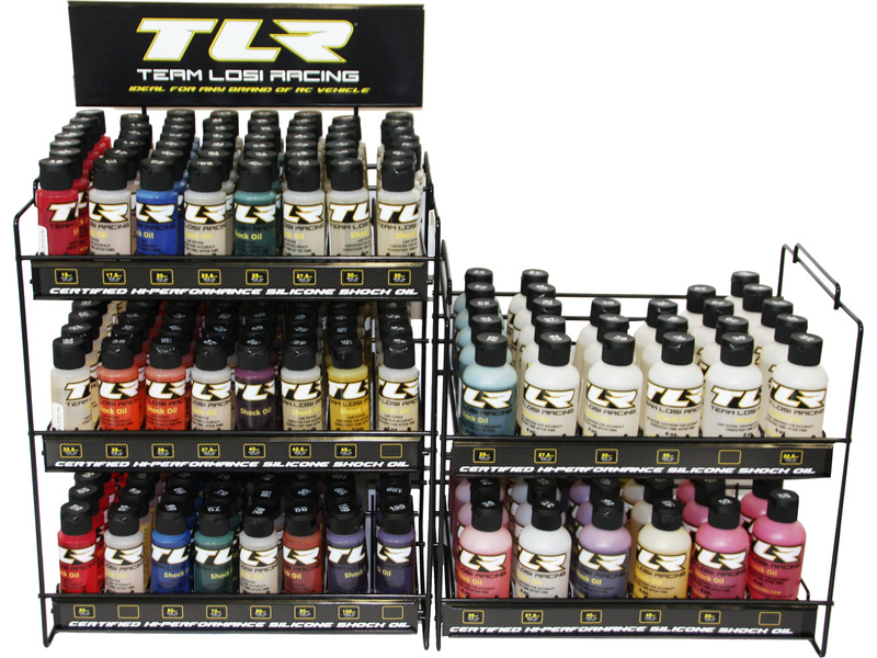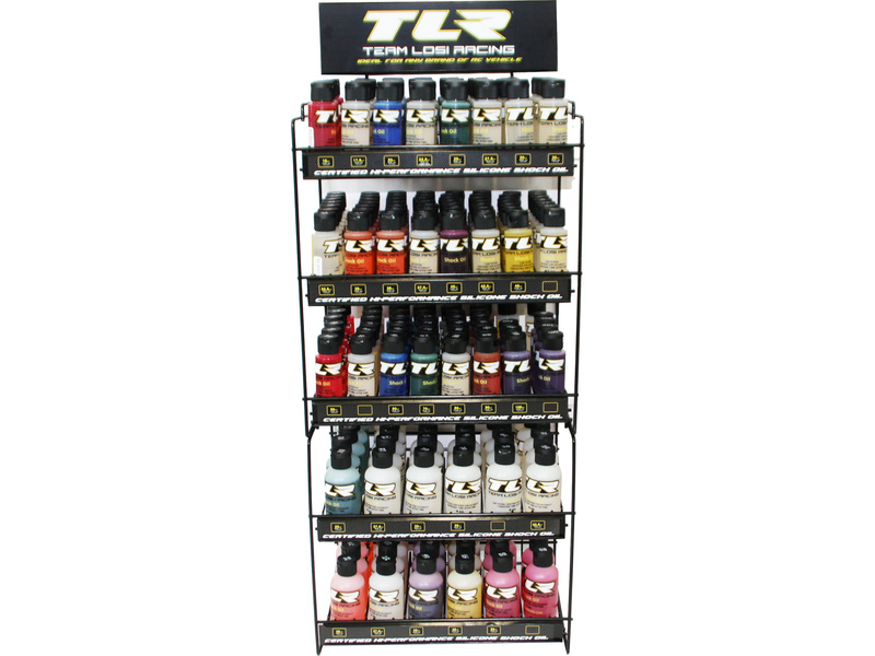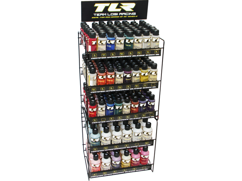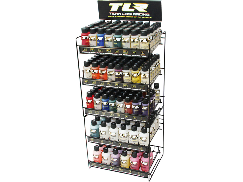 Prodejní 2-dílný stojan pro silikonové oleje s logem Team Losi Racing. Obsahuje samolepky pro popis druhů olejů ve stojanu. Obsahuje 50ks lahviček o objemu 120ml a 161ks lahviček o objemu 60ml. Vyrobeno v USA v rámci přísných technických tolerancí TLR.