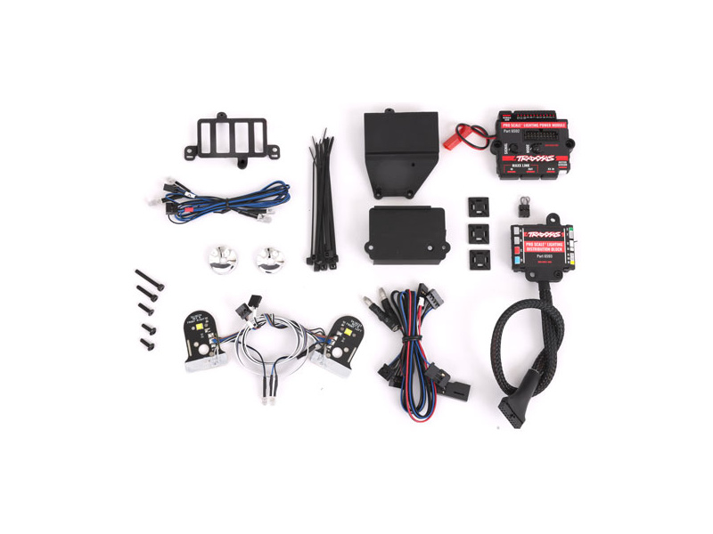 Balení obsahuje Pro Scale napájecí řídící modul LED, rozvodný modul LED, držák modulu, kabely senzoru motoru, propojovací kabel s přijímačem, propojovací Maxx kabel s přijímačem TQi, montážní příslušenství, komponenty LED osvětlení z instalační sady a LED světelné sady. Návod CZ.
