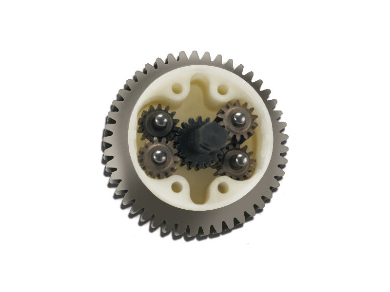 Převodovka, disková spojka a planetový diferenciál jsou uzavřeny do jednoho kompaktního celku. Převodovka s třecí spojkou spolehlivě přenáší výkon motoru na nápravy, planetová převodovka diferenciálu Magnum 272™ má ozubená kola vyrobená z kalené oceli. Tento systém vyžaduje naprosto minimální údržbu. K dispozici jsou pastorky a ozubená kola s různými počty zubů, takže si můžete model přesně vyladit pro rychlostí i technické tratě.